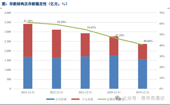 资产和负债结构方面,贵州银行资产主要由信贷资产和投资资产两部分构成,其中信贷资产行业集中度较高,主要分布在租赁及商业服务业,批发及零售业,水资源、环境及公共设施管理业,建筑业以及采矿业等投向市政项目和民生领域的信贷,近两年不良贷款率也有所上升,其中房地产业不良贷款率高达40.39%,同时近五年关注类贷款比率持续攀升,在房地产景气度偏低和区域环境不佳的背景下,资产质量短期内仍将承压;拨备覆盖率水平仍较好但边际弱化明显。金融投资方面,债券投资占比最高,区域城投债券在化债的背景下具备一定的优先属性,资产管理公司和信托计划等非标占比有所下降。贵州银行负债主要由吸收存款和应付债券构成,其存款结构逐步向个人客户倾斜,定期存款占比也逐年提升,但与同规模银行相比仍不高,且对债券、同业借款等依赖更高。