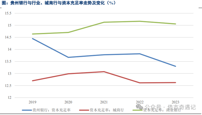 近几年贵州银行资本充足率呈下降趋势,2023年末为13.30%。目前来看,贵州银行虽高于城商行指标0.68个百分点左右,但与商业银行平均水平相比仍待提升。