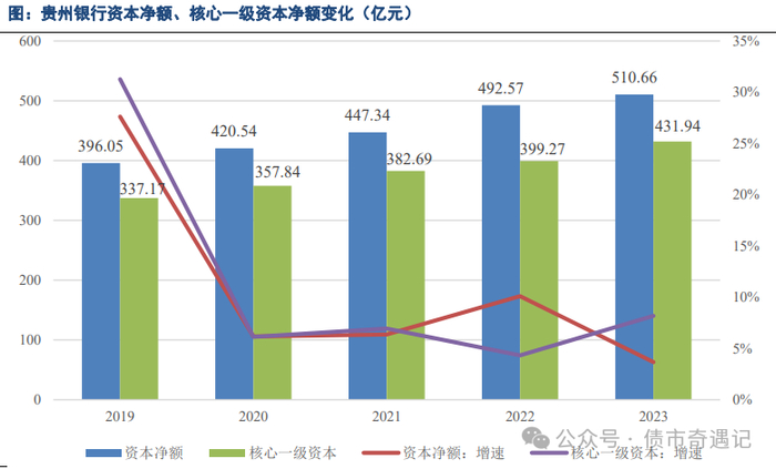 从分子――资本净额和核心一级资本净额来看,2023年末贵州银行的资本净额为510.66亿元,主要通过利润留存来补充资本,较2022年末的492.57亿元微增3.67%,从增速来看,2020年以来资本净额增速显著下降;核心一级资本净额为431.94亿元,较2022年末的399.27亿元,同比增长8.18%。目前贵州银行存量次级债2只,合计35亿元,均带有赎回条款,且最早的为2027年行权,贵州银行次级债赎回导致的资本补足压力短期不大。