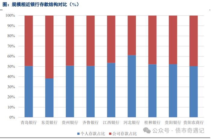 与同规模银行存款客户结构来看,贵州银行存款客户结构相对均衡,与规模相近银行相比,东莞银行以公司存款客户为主,河北银行和江西银行个人存款占比更高。与区域内的贵阳银行和贵阳农商行对比,贵阳银行个人存款客户高于公司存款客户,贵阳农商行与贵州银行结构相似。