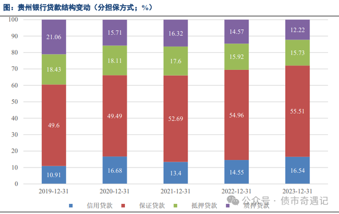 按贷款担保方式分类,贵州银行贷款以保证贷款为主,2023年末占比为55.51%,其次为信用贷款、抵押贷款,占比分别为16.54%、15.73%。从变化来看,信用贷款的增速较高,2019-2023年的复合增长率为29.33%,保证贷款增速也较高,复合增长率为19.88%,质押贷款复合增速最低,仅1.73%,其占比也逐年下降。