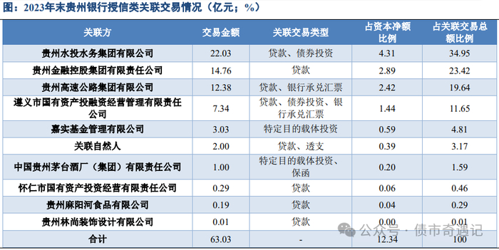 关联交易方面,截至2023年末,贵州银行授信类关联交易余额为63.03亿元,占资本净额比例为12.34%,较2022年(52.87亿元)有所上升,主要是由于贵州水投水务集团有限公司交易金额较2022年增加了6.15亿元。截至2023年末授信类关联交易如下表,授信余额最大的关联方为贵州水投水务集团有限公司(第五大股东),即贵州国资委旗下相关平台,交易类型主要为贷款和债券投资;第二大关联方为贵州金融控股集团有限责任公司,由贵州省财政厅全资控股,交易类型主要为贷款;第三大关联方为贵州高速公路集团有限公司(第八大股东),交易类型为贷款和银行承兑汇票,前三大授信类关联交易方均为贵州银行股东,且实控人均为贵州省国资委/财政厅下属企业,城投性质较强,主要负责当地的基础设施建设等。遵义国投(第三大股东)和怀仁市国有资产投资经营有限责任公司分别由遵义市国资委和怀仁市国资委实控,交易类型主要是贷款、债券投资和银行承兑汇票等,此外还有关联自然人贷款、透支等。整体来看,发行人关联交易大部分为与股东的关联交易,且主要关联方企业全部为国有企业。