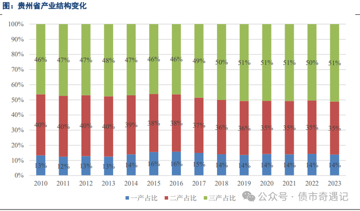 经济与产业变化方面,基建的发展理应带动经济的发展,任何一个地方基建的完善应该伴随着产业的升级变化或者产业结构的调整,不然可能就是基建资源的浪费,又或者映射出当地经济发展过程中的问题。而从产业发展来看,贵州省似乎就是后者,大肆搞基建的背后并未带来产业结构的发展或变化。贵州省的三产占比并未发生显著变化,2023年与2010年相比,第三产业占比有所上升,工业占比微降,第一产业变化不大。