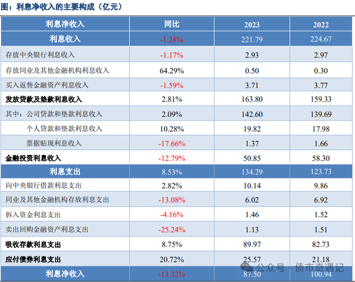 从利息收入的构成来看,2023年贵州银行利息收入同比下降1.28%,利息收入主要是贷款利息收入和金融投资的利息收入构成,其中金融投资利息收入同比大幅下降12.79%,债券市场收益率持续下行对其影响较为明显,债券市场偏低收益率的现象短期内大概率依然存在,再配置压力继续凸显;在利息收入同比下降的背景下,贵州银行2023年利息支出同比增长8.53%,利息支出主要由吸收存款和应付债券的利息支出构成,2023年该两者的利息支出同比均上升。可见,在资产收益下降的情况下,贵州银行的成本端压力更显突出。