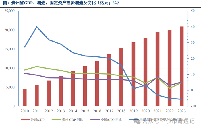从区域经济与财政实力来看,2023年贵州省GDP 20913.25亿元,排名全国第22位,仅次于内蒙古;GDP增速为4.9%,排名全国第21位。2010年以来,贵州省本着“要想富、先修路”的思路,大力搞基建,下表所示为贵州银行2010年以来的GDP及同比变化,可以看出2021年之前贵州省的GDP增速是在全国增速水平之上的,当然,这其中大部分是靠固定资产投资的拉动作用,2019年起贵州省固定资产投资增速大幅下降,而贵州省的GDP增速与全国的增速的差距也逐渐缩小甚至被超越。
