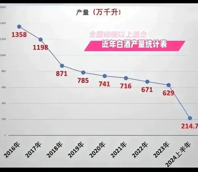中国白酒产量在2016年达到顶峰1358万千升,此后逐年下降,截至2023年已“七连降”,只有629万千升了,腰斩不止。但行业收入水平只增不减,2023年全国白酒行业完成销售收入7563亿元,同比增加9.7%;实现利润总额2328亿元,同比增长7.5%。