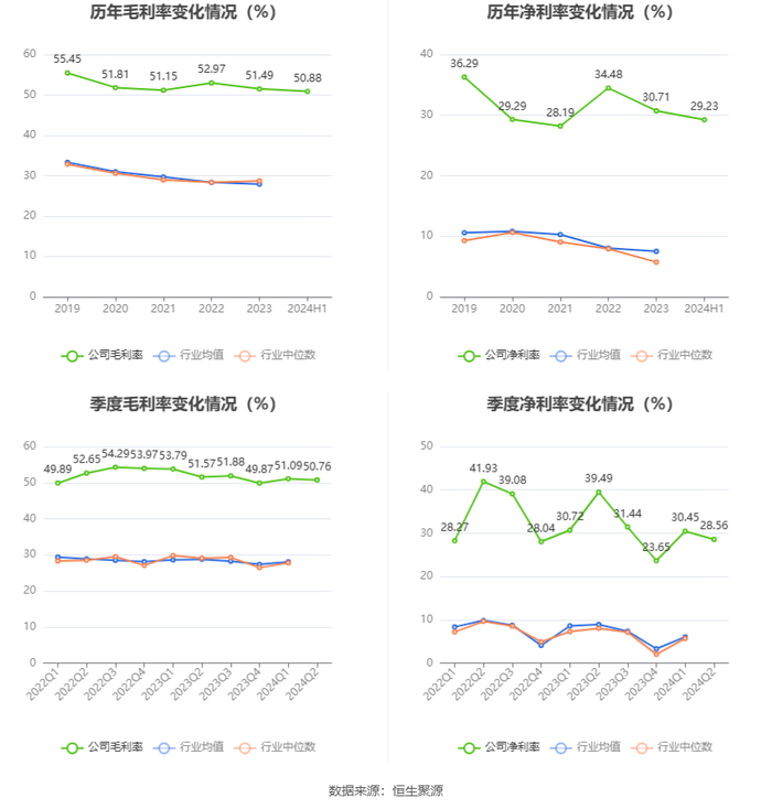 2024年上半年,公司毛利率为50.88%,同比下降1.62个百分点;净利率为29.23%,较上年同期下降6.57个百分点。从单季度指标来看,2024年第二季度公司毛利率为50.76%,同比下降0.81个百分点,环比下降0.33个百分点;净利率为28.56%,较上年同期下降10.93个百分点,较上一季度下降1.89个百分点。