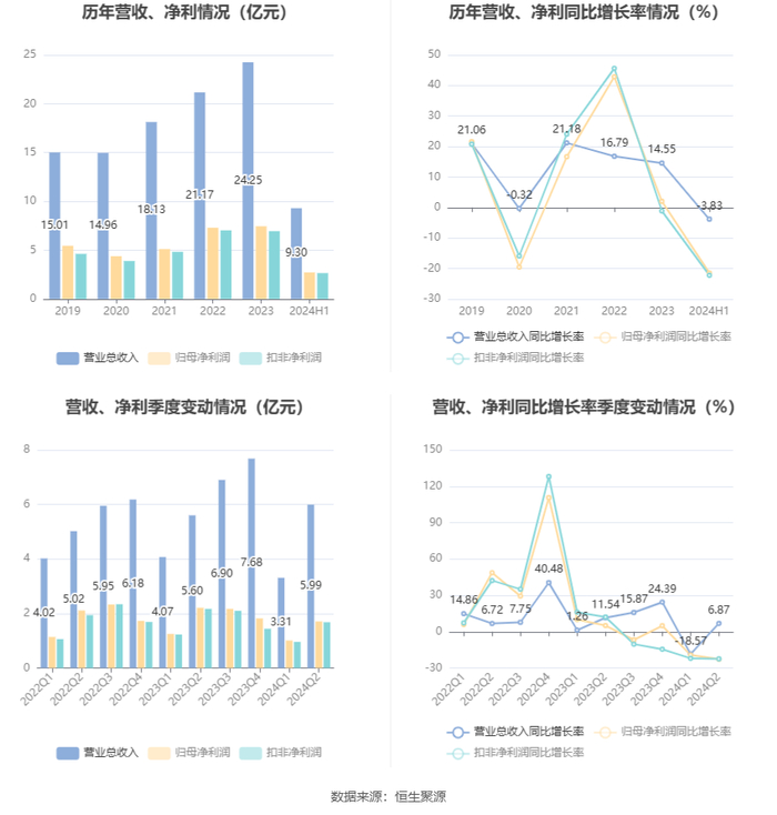 根据半年报,公司第二季度实现营业总收入5.99亿元,同比增长6.87%,环比增长80.70%;归母净利润1.71亿元,同比下降22.71%,环比增长69.50%;扣非净利润1.68亿元,同比下降22.42%,环比增长75.24%。
