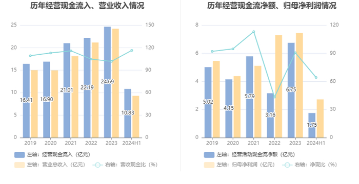 2024年上半年,公司营业收入现金比为116.44%,净现比为64.24%。