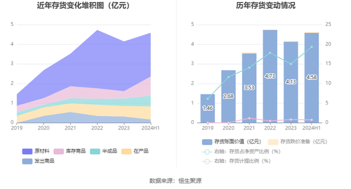 从存货变动来看,截至2024年上半年末,公司存货账面价值为4.58亿元,占净资产的19.35%,较上年末增加4482.3万元。其中,存货跌价准备为346.94万元,计提比例为0.75%。