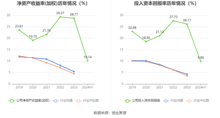 数据显示,2024年上半年公司加权平均净资产收益率为10.14%,较上年同期下降4.25个百分点;公司2024年上半年投入资本回报率为9.86%,较上年同期下降3.14个百分点。