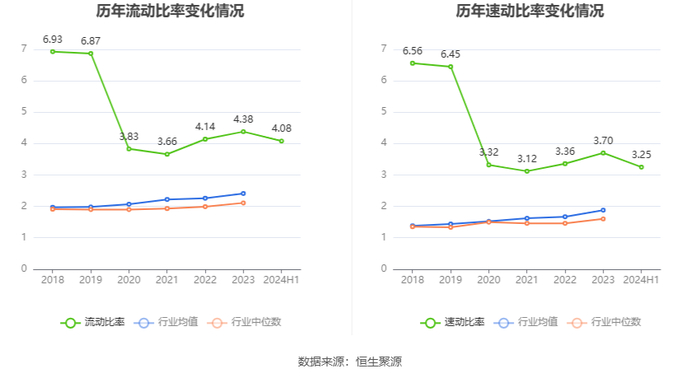 2024年上半年,公司流动比率为4.08,速动比率为3.25。