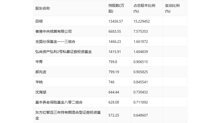 半年报显示,2024年上半年末公司十大流通股东中,新进股东为全国社保基金一一三组合、基本养老保险基金八零二组合,取代了一季度末的全国社保基金四零六组合、安本亚洲有限公司-安本基金-中国A股可持续股票基金。在具体持股比例上,田明、弘尚资产弘利2号私募证券投资基金、岑青、郝先进、岑皖、沈海斌、东方红智远三年持有期混合型证券投资基金持股有所上升,香港中央结算有限公司持股有所下降。