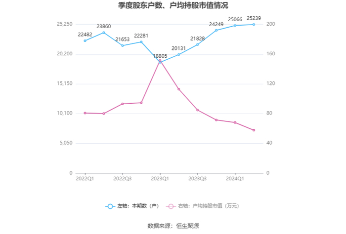 筹码集中度方面,截至2024年上半年末,公司股东总户数为2.52万户,较一季度末增长了173户,增幅0.69%;户均持股市值由一季度末的68.11万元下降至57.68万元,降幅为15.31%。