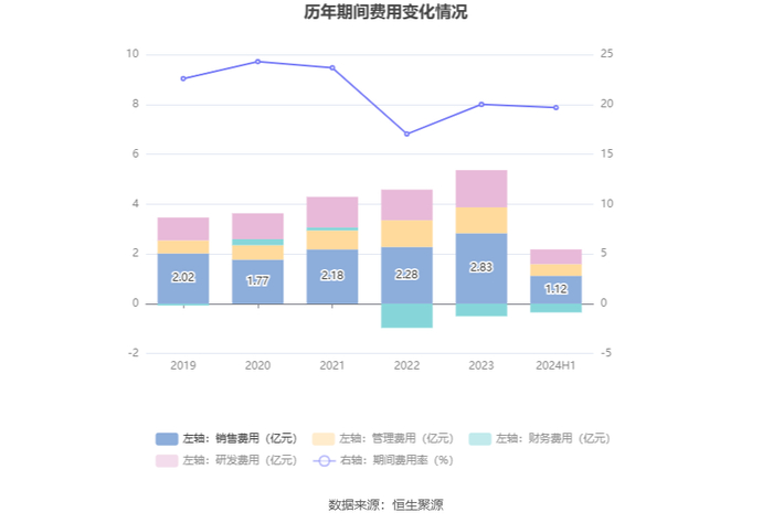 2024年上半年,公司期间费用为1.83亿元,较上年同期增加5085.24万元;期间费用率为19.68%,较上年同期上升6.01个百分点。其中,销售费用同比增长28.26%,管理费用同比增长7.39%,研发费用同比增长20.63%,财务费用由去年同期的-4754.06万元变为-3468.91万元。