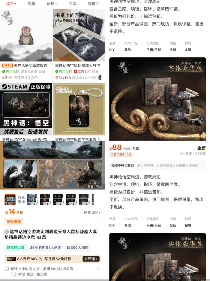 相比正版授权的周边,价格明显更低。以《黑神话:悟空》实体豪华版为例,正版联名为820元,而同款盗版产品的售价则为88元。