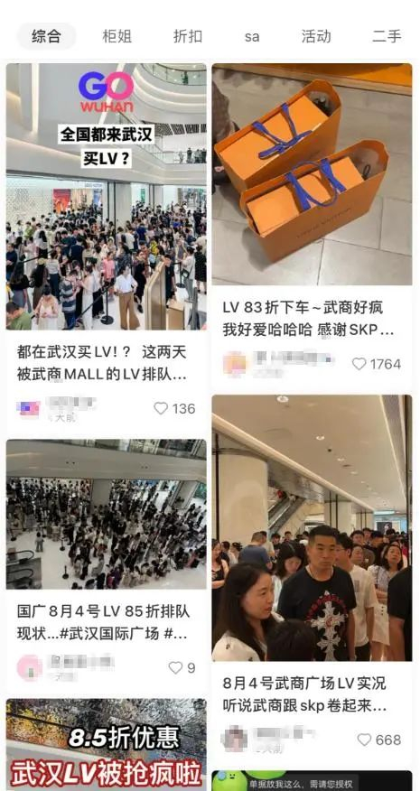 这一消息迅速传遍了互联网:小红书、抖音等平台上,不少武汉本地网友发帖晒出了自己在武商MALL买到的LV包包,有的享受到85折优惠,还有的甚至接近83折,评论区有网友表示“正在来武汉的高铁上”。