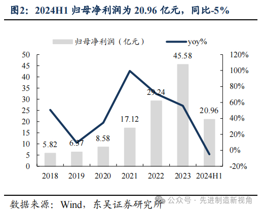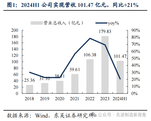 2024上半年公司实现营收101.47亿元,同比+21%,其中设备及服务收入73.68亿元,同比+21%,占比73%,材料业务收入23.67亿元,同比+26%,占比23%;归母净利润为20.96亿元,同比-4.97%;扣非归母净利润为20.94亿元,同比+1.02%。