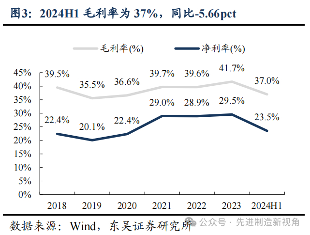 2024Q2单季毛利率为31.78%,同比-12.41pct,环比-11.74pct,销售净利率为18.57%,同比-13.2pct,环比-11.19pct。