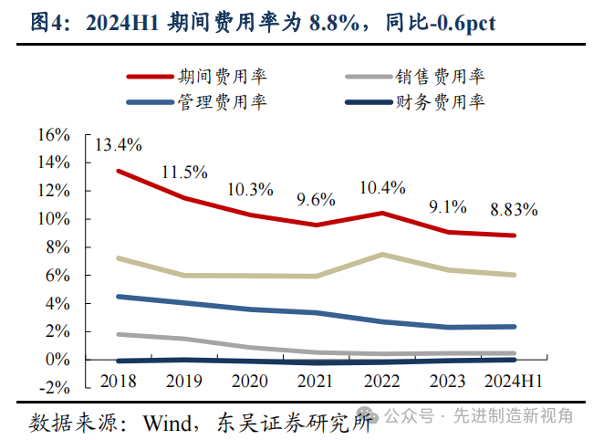 2024上半年毛利率为37.00%,同比-5.66pct,其中设备及其服务的毛利率为37.43%,同比-2.70pct,主要系低毛利率的自动化项目收入占比有所提升;材料毛利率为40.15%,同比-14.51pct,主要系Q2石英坩埚价格出现较大幅度下滑,下游开工率降低;销售净利率为23.54%,同比-6.66pct,其中坩埚业务净利率约42%,同比-9pct;期间费用率为8.8%,同比-0.6pct,其中销售费用率为0.5%,同比+0.1pct,管理费用率(含研发)为8.4%,同比-0.8pct,财务费用率为0.0%,同比+0.1pct。