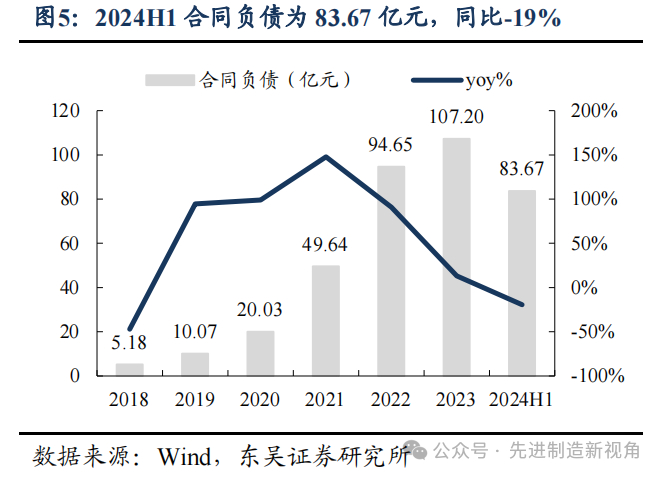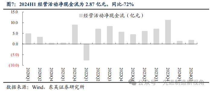 截至2024Q2末公司合同负债为83.67亿元,同比-19%,存货为137.61亿元,同比-8%。2024H1经营活动净现金流为2.87亿元,同比-71.83%,表明订单回款有一定压力。