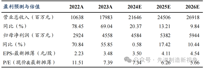 光伏设备是晶盛机电成长的第一曲线,第二曲线是光伏耗材和半导体耗材的放量,第三曲线是碳化硅设备+材料和半导体设备的放量。我们预计公司2024-2026年归母净利润为46(原值56,下调18%)/54(原值65,下调17%)/59(原值73,下调19%)亿元,对应PE为7/6/6倍,维持“买入”评级。