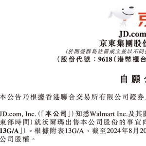 8月21日晚间,京东集团发布公告称,沃尔玛于美东时间8月20日就沃尔玛出售公司股份的事宜向证券交易委员会提交了附表13G/A,截至当天,沃尔玛不再持有公司股权。