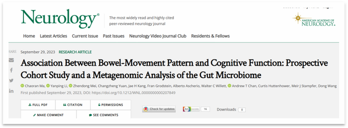 [1] Ma C, Li Y, Mei Z, Yuan C, et al. Association Between Bowel-Movement Pattern and Cognitive Function: Prospective Cohort Study and a Metagenomic Analysis of the Gut Microbiome. Neurology. 2023 Sep 29:10.