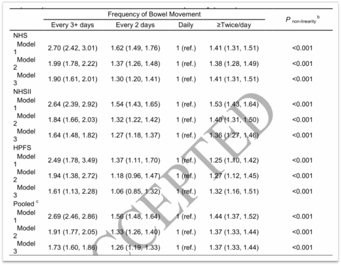研究者将研究人群按照排便频率分为四类:每三天或更久,每隔一天,每天,每天两次或更多次。在排便频率评估时,NHS研究人群的平均年龄为75.7岁,NHSII为58.6岁,HPFS为74.5岁。