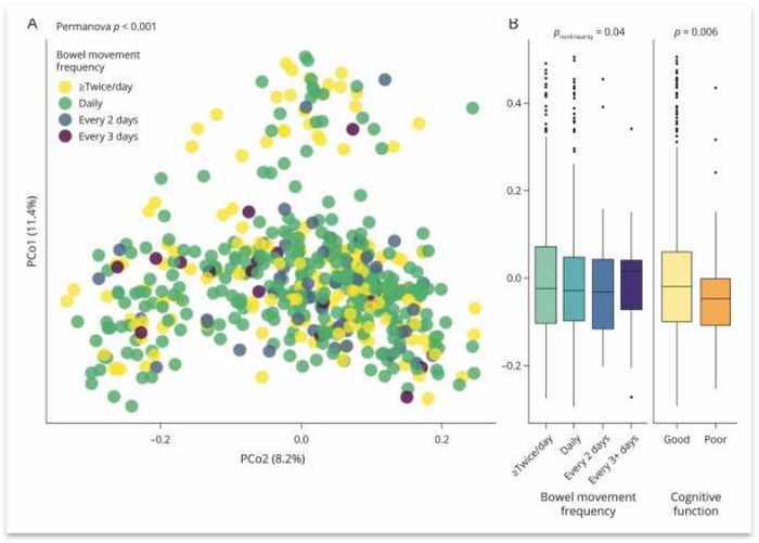 △ 排便频率、认知功能与肠道微生物群整体变化的关系(来源:参考资料1)