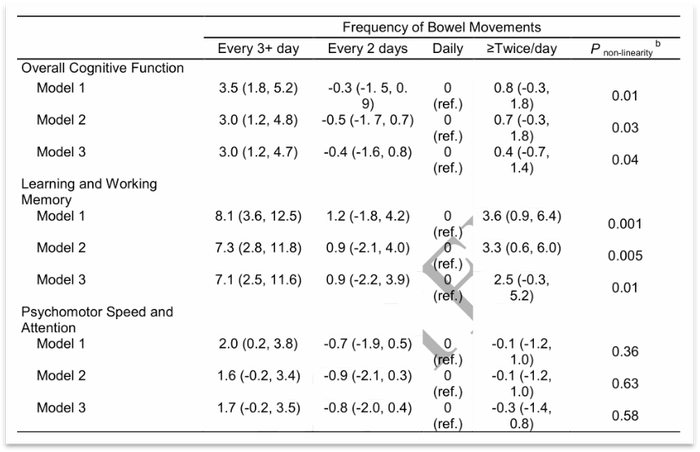 研究者使用CogState计算机神经心理评价软件来评估客观认知功能,研究显示,在对潜在混杂因素进行调整后,排便频率与客观认知功能呈现反J形剂量反应方式相关。并且学习和工作记忆以及精神运动速度和注意力也存在类似的剂量-反应关联。