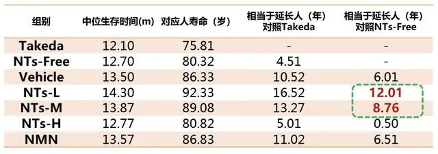 在进行严格的数据比对后,显示的结果令人惊讶:摄入补充核苷酸的小鼠寿命不仅比文献报道的平均小鼠寿命延长了14.63%-18.18%,还比对照组小鼠寿命延长了9.21—12.6%。