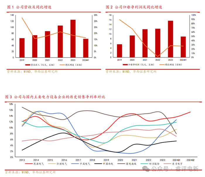 公司深耕输配电领域数载,持续专注研发创新,产品品类覆盖广泛,2024H1年研发费用率达7.21%,同比增长0.29pct。公司核心竞争力不断巩固,业绩增长稳健,2024H1公司实现营收61.7亿元,同比增长16%;实现归母净利润8.9亿元,同比增长27%。同时,公司盈利能力较强,销售净利率整体处于行业领先水平,2024H1公司销售净利率达14.54%,同比增长0.83pct。