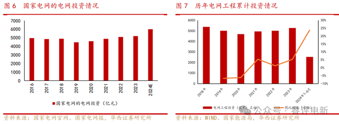 电网投资持续加大。2020年国家电网的电网投资开始回升,2020-2022年完成电网投资分别为4605、 4882、5094亿元,2023年国家电网电网投资额超5200亿元。2024年国家电网预计电网投资将超6000亿元,电网投资力度加大。同时,据人民日报报道,2024年南方电网公司固定资产投资安排达1730亿元,同比增长23.5%,投资规模连续4年维持在1250亿元以上。