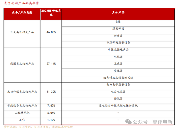 专注研发创新&品类拓展,核心竞争力持续巩固。公司深耕输配电领域数载,持续专注研发创新,2024H1年研发费用率达7.21%,同比增长0.29pct。基于持续的研发投入,公司产品品类不断拓宽,覆盖范围广泛,目前成长为输配电设备行业中少数几家具备电力系统一次设备(传统机械类电力设备)、二次设备(控制类电力设备)、电力电子设备等产品的研发、制造和解决方案能力的厂家之一。