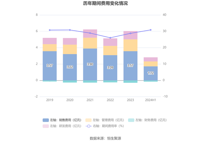2024年上半年,公司期间费用为2.66亿元,较上年同期增加2902.95万元;期间费用率为30.87%,较上年同期上升3.36个百分点。其中,销售费用同比增长13.62%,管理费用同比增长8.3%,研发费用同比增长7.64%,财务费用由去年同期的-1515.84万元变为-1481.95万元。