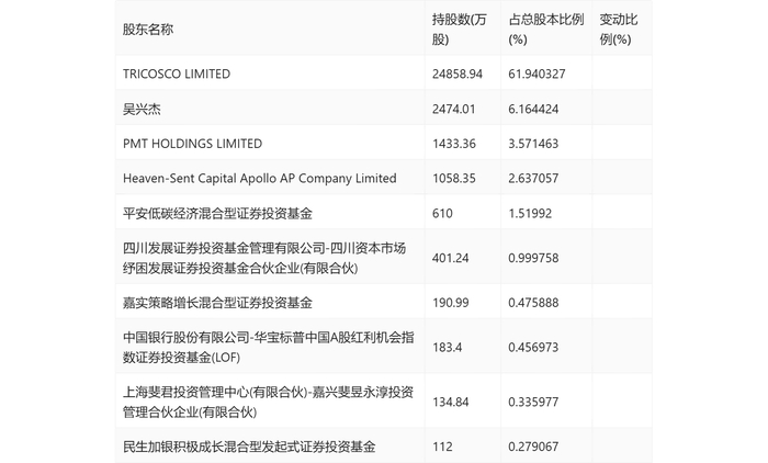 半年报显示,2024年上半年末公司十大流通股东中,新进股东为平安低碳经济混合型证券投资基金、四川发展证券投资基金管理有限公司-四川资本市场纾困发展证券投资基金合伙企业(有限合伙)、民生加银积极成长混合型发起式证券投资基金,取代了一季度末的招商量化精选股票型发起式证券投资基金、交银施罗德瑞元三年定期开放混合型证券投资基金、杭州图谱光电科技有限公司。在具体持股比例上,中国银行股份有限公司-华宝标普中国A股红利机会指数证券投资基金(LOF)持股有所上升,Heaven-Sent Capital Apollo AP Company Limited、嘉实策略增长混合型证券投资基金持股有所下降。