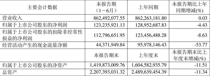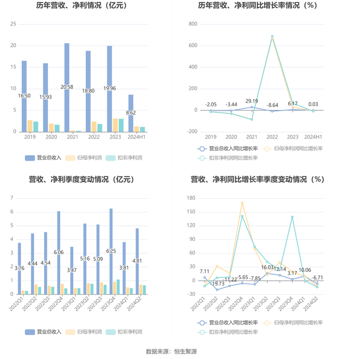 根据半年报,公司第二季度实现营业总收入4.81亿元,同比下降6.71%,环比增长26.11%;归母净利润7119.88万元,同比下降12.71%,环比增长36.82%;扣非净利润6699.5万元,同比下降13.78%,环比增长46.27%。