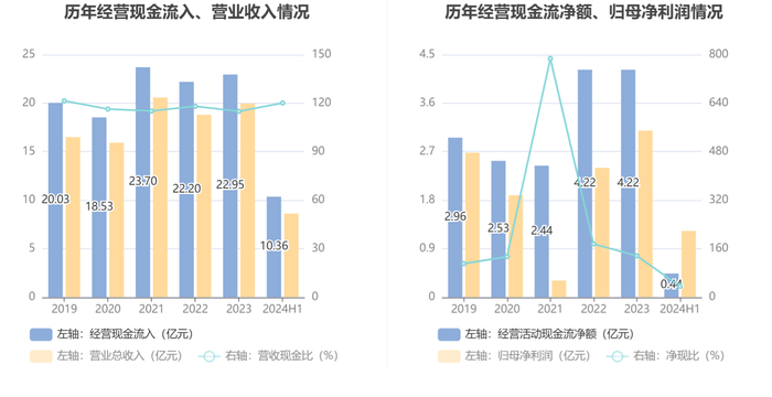 2024年上半年,公司营业收入现金比为120.11%,净现比为36.01%。