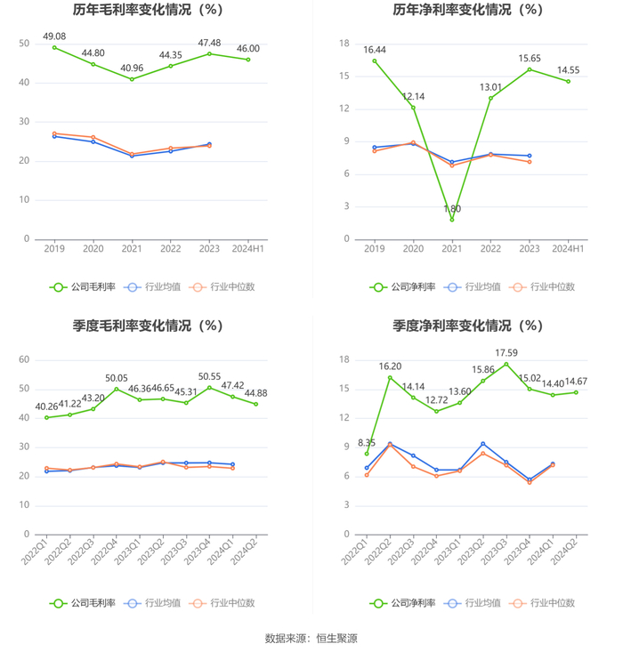 2024年上半年,公司毛利率为46.00%,同比下降0.53个百分点;净利率为14.55%,较上年同期下降0.40个百分点。从单季度指标来看,2024年第二季度公司毛利率为44.88%,同比下降1.77个百分点,环比下降2.54个百分点;净利率为14.67%,较上年同期下降1.19个百分点,较上一季度上升0.27个百分点。