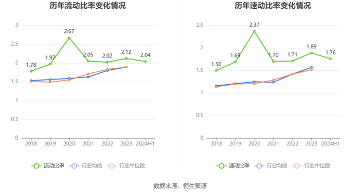 2024年上半年,公司流动比率为2.04,速动比率为1.76。