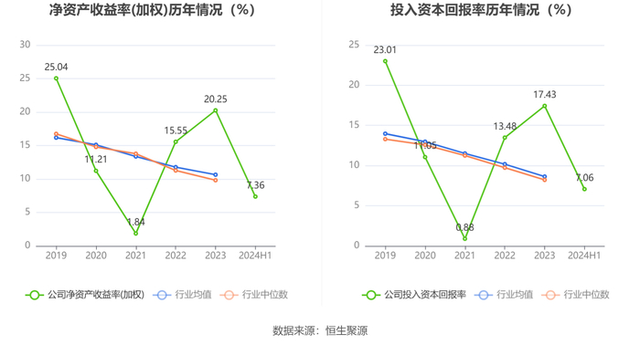 数据显示,2024年上半年公司加权平均净资产收益率为7.36%,较上年同期下降0.62个百分点;公司2024年上半年投入资本回报率为7.06%,较上年同期下降1.28个百分点。