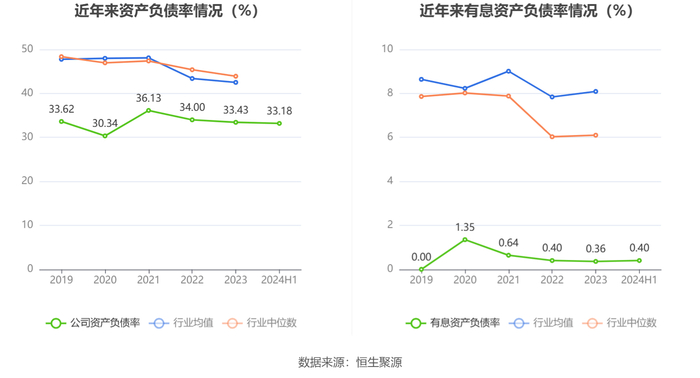 在偿债能力方面,公司2024年上半年末资产负债率为33.18%,相比上年末下降0.25个百分点;有息资产负债率为0.40%,相比上年末上升0.04个百分点。