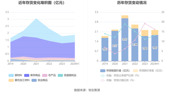 从存货变动来看,截至2024年上半年末,公司存货账面价值为1.87亿元,占净资产的13.18%,较上年末增加757.75万元。其中,存货跌价准备为3634.47万元,计提比例为16.26%。