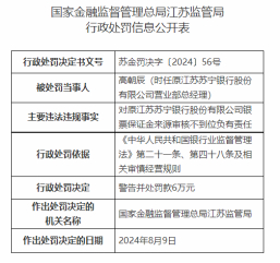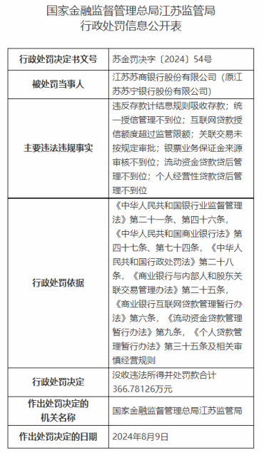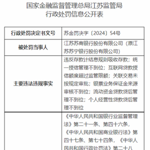 东方资讯消息,日前,国家金融监督管理总局江苏监管局行政处罚信息公开表显示,因违反存款计结息规则吸收存款;统一授信管理不到位;互联网贷款授信额度超过监管限额;关联交易未按规定审批;银票业务保证金来源审核不到位;流动资金贷款贷后管理不到位;个人经营性贷款贷后管理不到位,对江苏苏商银行股份有限公司(原江苏苏宁银行股份有限公司)没收违法所得并处罚款合计366.78126万元。