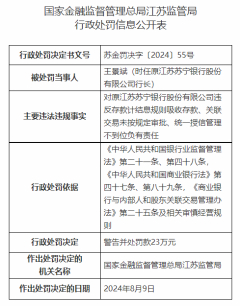因对违反存款计结息规则吸收存款、关联交易未按规定审批、统一授信管理不到位事项负有责任,对时任原江苏苏宁银行股份有限公司行长王景斌进行警告并处罚款23万元处罚。