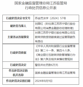 因对互联网贷款授信额度超过监管限额事项负有责任,对时任原江苏苏宁银行股份有限公司消费金融部总经理助理刘丽红进行警告并处罚款6万元处罚。