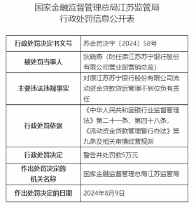 因对流动资金贷款贷后管理不到位事项负有责任,对时任原江苏苏宁银行股份有限公司营业部市场总监罗霄锋进行警告并处罚款6万元处罚。