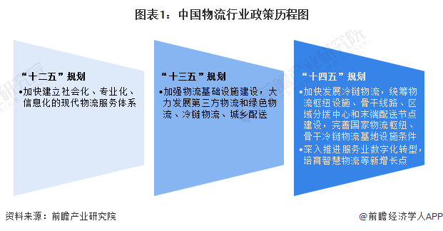 物流是跨部门和跨行业的复合型服务产业,是国民经济的重要组成部分。“十二五”时期,加快建立社会化、专业化、信息化的现代物流服务体系是主要工作内容;“十三五”时期,行业的发展重点是基础设施建设及第三方物流、绿色物流、冷链物流等细分领域;“十四五”时期,物流枢纽基础设施建设和智慧物流为重点规划发展方向。