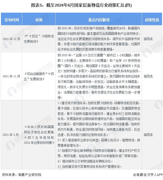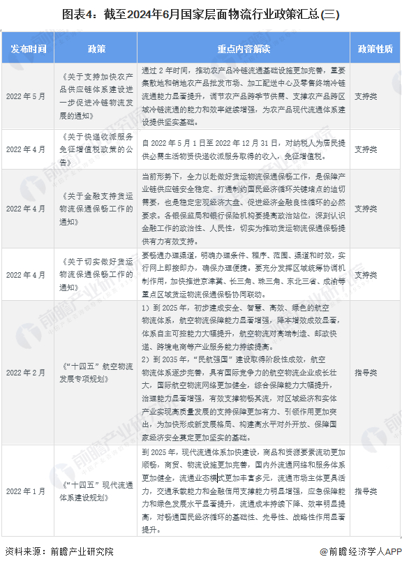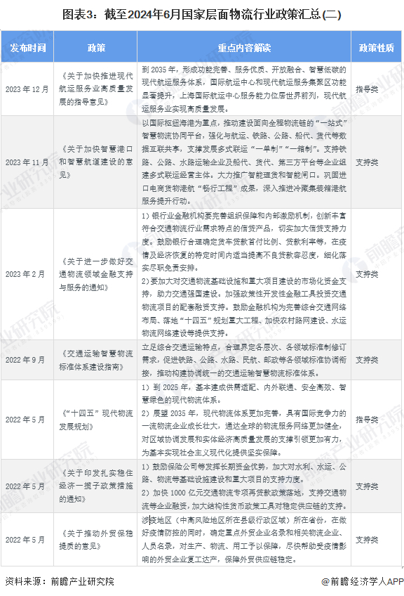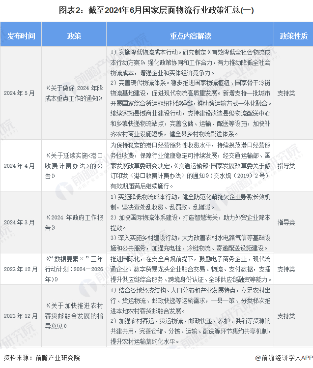 国家层面的物流政策导向与宏观环境紧密联系,在疫情环境下,2022年出台的多数相关政策集中在加强金融对物流的资金扶持力度方面,2023年以来的政策重点放在了降本、提升国际竞争力、智慧物流等方面。截至2024年6月,国家层面物流行业政策汇总如下: